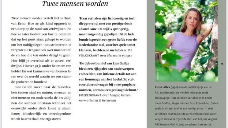Met de eerste royalty-opbrengsten van mijn boek 'Twee mensen worden' ga ik minstens 30 bomen planten in een project naar keuze. Mijn roman gaat onder andere over een bos dat dreigt gekapt te worden om een industrieterrein te vergroten. Mijn hoofdpersonage Echo gaat dat bos bezetten om die kap te proberen voorkomen.