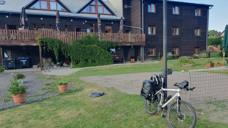 Mijn eerste dag zit er op; 104 km gefietst, 2000 hoogtemeters en 39% van de route onverhard gereden. Mijn start was in het voor mij geliefde en bekende Trutnov in Tsjechië. Nu ben ik neergestreken in een berghotel dat eigenlijk vol was. Ik mag nu met mijn tent vanavond de nacht doorbrengen in de tuin van het hotel. Super aardig, reizen met de fiets doet mensen echt goed, iedereen heeft begrip en denkt met je mee.